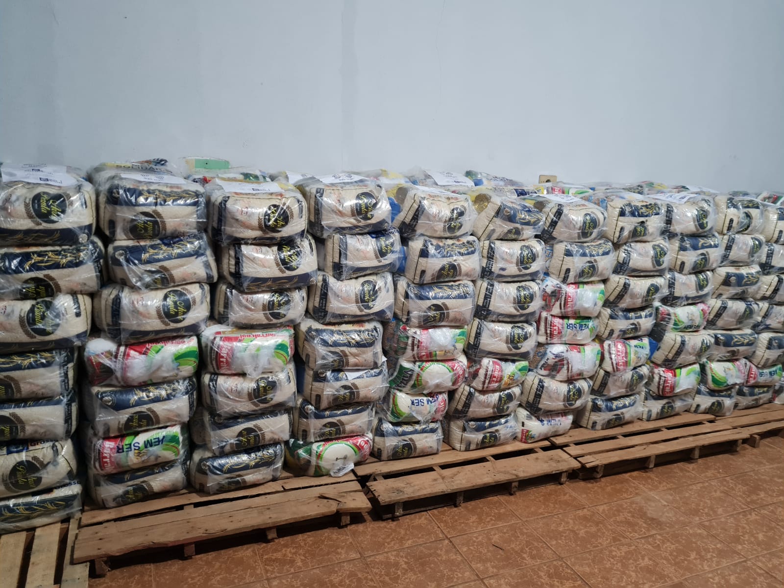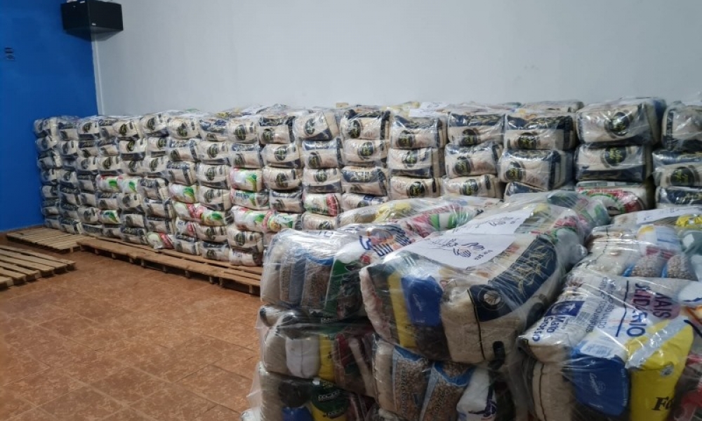 As cestas básicas são compostas por arroz, feijão, macarrão, óleo, sal, açúcar, café, farinha de trigo, sardinha, extrato de tomate, além de materiais de limpeza e de higiene pessoal.