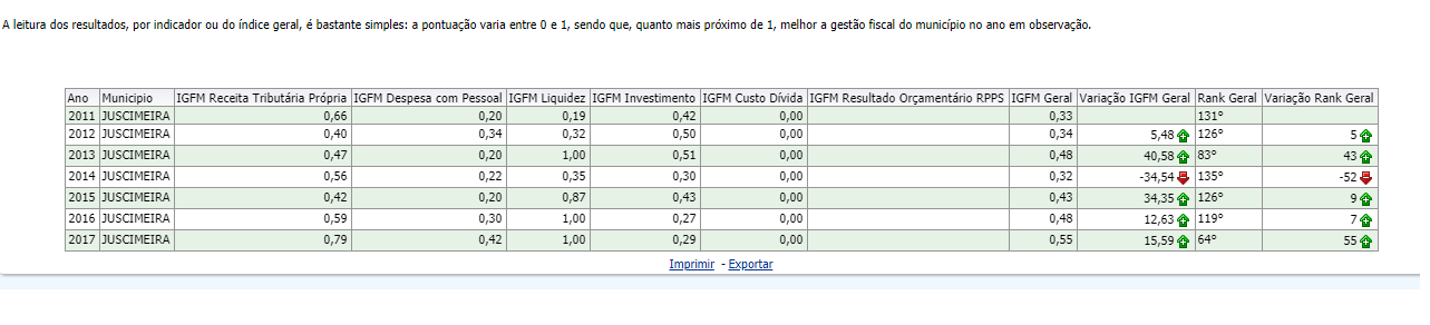 A avaliação do IGFM é composto pela média de 5 índices com os seguintes pesos: IGFM Receita Tributária Própria (0,79); -IGFM Despesa com Pessoal (0,42%); -IGFM Investimentos (0,29); -IGFM Liquidez (1,00) e -IGFM Custo da Dívida (0,00). A leitura desses resultados é bastante simples: a pontuação varia entre 0 e 1, sendo que, quanto mais próximo de 1, melhor a gestão fiscal do município no ano em observação.